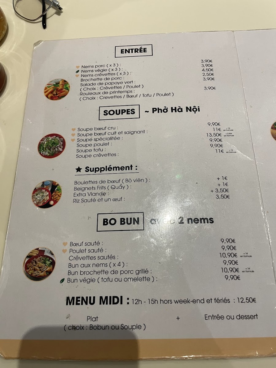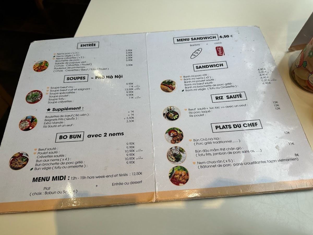 Loved the food - one of the best bun dishes I ever had. The Pho is also excellent (my wife and son had that). Came back the next day as it was a nice refreshing break from the heavy French cuisine. Should note that the restaurant is very clean... since we don’t speak French we used Google translator. Bon appetit